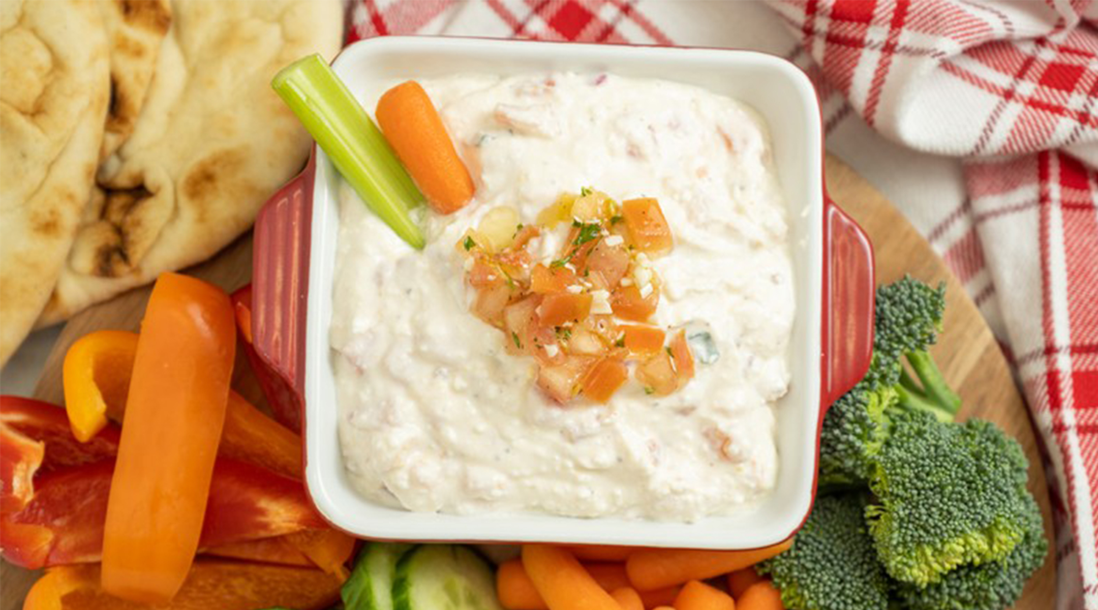 Creamy and oh-so-fresh! Made with sour cream and sheep’s milk feta, this dip is the perfect partner for fresh veggies, pita, or our Pita Chips! Makes a great healthy snack for lunches!