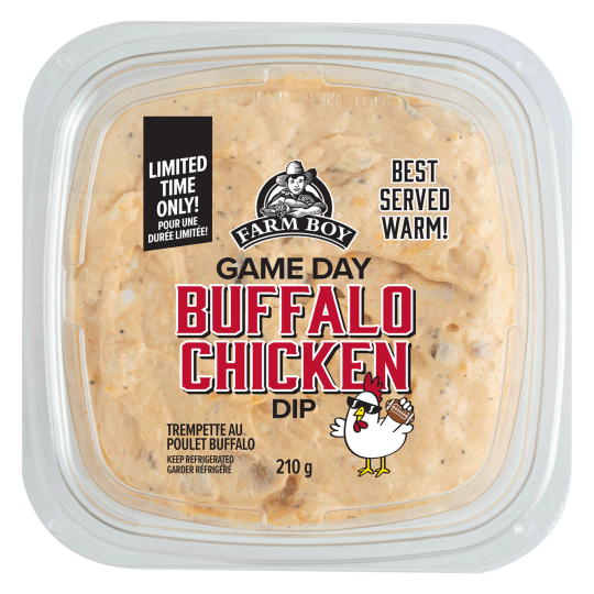 Dip Base (Cream Cheese, Sour Cream, Mayonnaise, Lemon Juice, Salt, Black Pepper) • Seasoned Cooked Chicken (Chicken Breast, Canola Oil, Olive Oil, Lemon Juice, Garlic, Black Pepper) • Cheddar Cheese • Farm Boy Spicy Buffalo Sauce (Hot Sauce, Sugar, Butter, Water, Onion Powder, Garlic Powder, Paprika, Cayenne Pepper) • Bacon (Pork, Water, Salt, Sugar, Sodium Phosphate, Sodium Erythorbate, Sodium Nitrite, Black Pepper, Propionic Acid, Canola Oil, Smoke) • Green Onions • Buffalo Ranch Seasoning. Contains: Milk • Eggs • Mustard. May Contain: Peanuts • Tree Nuts • Sesame • Seafood/Fish • Soy • Wheat • Sulphites.