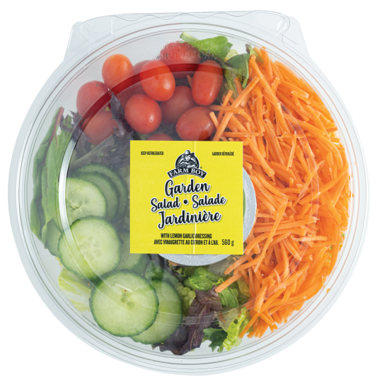 Tomatoes • Romaine Lettuce • Cucumber • Carrots • Red Cabbage • Lettuce Spring Mix (Lollo Rosa, Red Leaf, Romaine (Red, Green), Bulls Blood, Chard (Red, Green, Gold), Tango, Mizuna, Green Oak, Tatsoi, Spinach, Frisée) • Farm Boy Lemon Garlic Dressing: Sunflower Oil • Vinegar • Lemon Juice (Water, Concentrated Lemon Juice, Lemon Oil) • Extra Virgin Oil • Dehydrated Garlic • Sea Salt • Pepper • Garlic Essence • Xanthan Gum. May Contain: Peanuts • Tree Nuts • Sesame • Milk • Eggs • Seafood/Fish • Soy • Wheat/Gluten • Sulphites • Mustard.