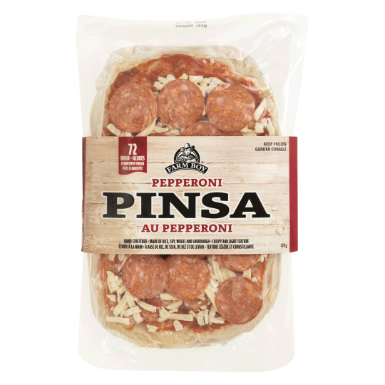 Pâte À Pinsa (Farine De Blé, Farine De Blé Einkorn Biologique, Farine De Riz Biologique, Farine De Gourgane Biologique, Culture De Levain, Eau, Huile D'olive, Sel, Levure) • Sauce Tomate (Tomates Pelées Entières, Purée De Tomate, Basilic, Sel, Huile D'olive) • Fromage Mozzarella (Lait, Substances Laitières Modifiées, Crème, Sel, Culture Bactérienne, Chlorure De Calcium, Enzyme Microbienne, Cellulose, Natamycine) • Pepperoni (Porc, Sel, Dextrose, Épices, Nitrite De Sodium, Sucre Fumé, Érythorbate De Sodium, Culture Lactique). Contient : Blé • Lait.