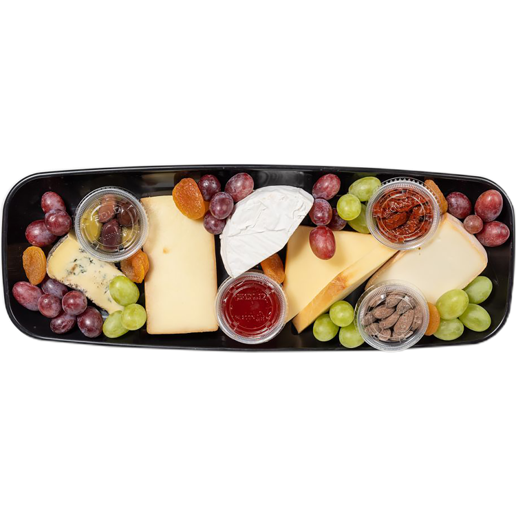 This Canadian cheese platter is a patriotic party favourite. Enjoy five kinds of cheese made right here in Canada. Garnished with fresh and dried fruit (grapes and apricots), roasted almonds, olives and sun-dried tomatoes, the pairing options are plentiful.