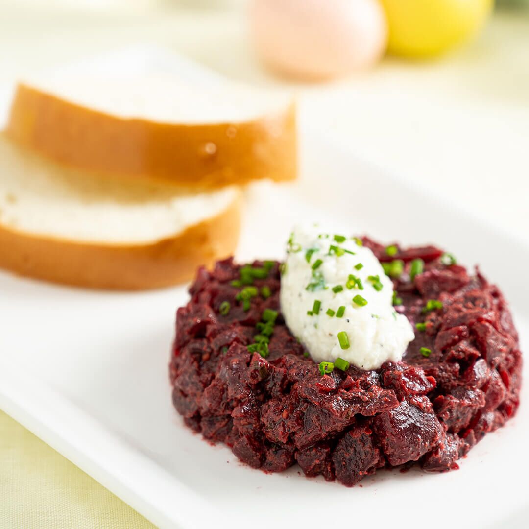 | Beet Tartare with Honey Whipped Ricotta | Scoop beet tartare onto plates and top with Honey Whipped Ricotta. Serve Chilled. Serve with Garlic Buns. |