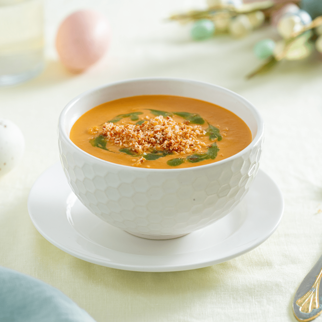 | Carrot Tomato Soup with Herb Oil and Sundried Tomato Panko Crunch | Place soup in medium saucepan and simmer over medium low heat, for 5 minutes, until temperature reaches 165°F. Garnish with Tomato Panko. |