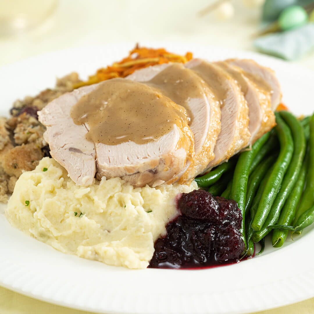 | Roast Turkey Breast, Cranberry Apple Sausage Stuffing | Place turkey and stuffing container on tray and bake, uncovered at 350°F (177°C) for 40-50 minutes, or until internal temperature reaches 165°F (74°C). |