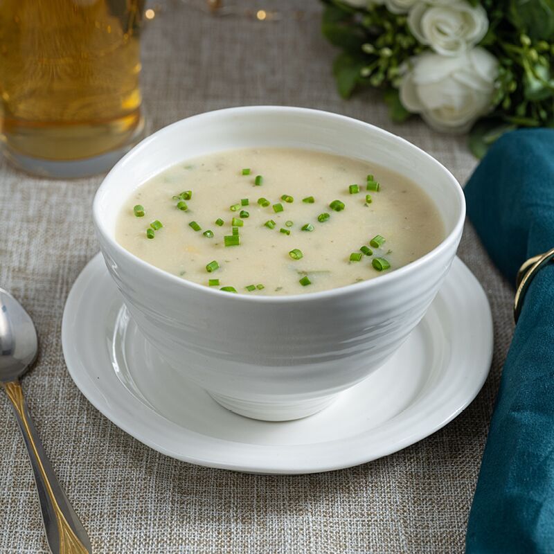 | Pilsner & Potato Chowder | Place soup in medium saucepan and simmer over medium low heat until internal temperature reaches 165°F (74°C). |