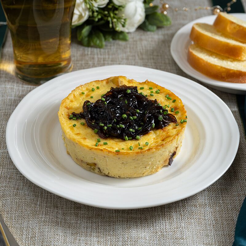 | Irish Cheese Flan with Balsamic Glazed Onions | Place container on oven safe tray and bake, uncovered, at 350°F for 10 minutes, until internal temperature reaches 165°F (74°C). Slice, serve, and garnish with Balsamic Onions. |