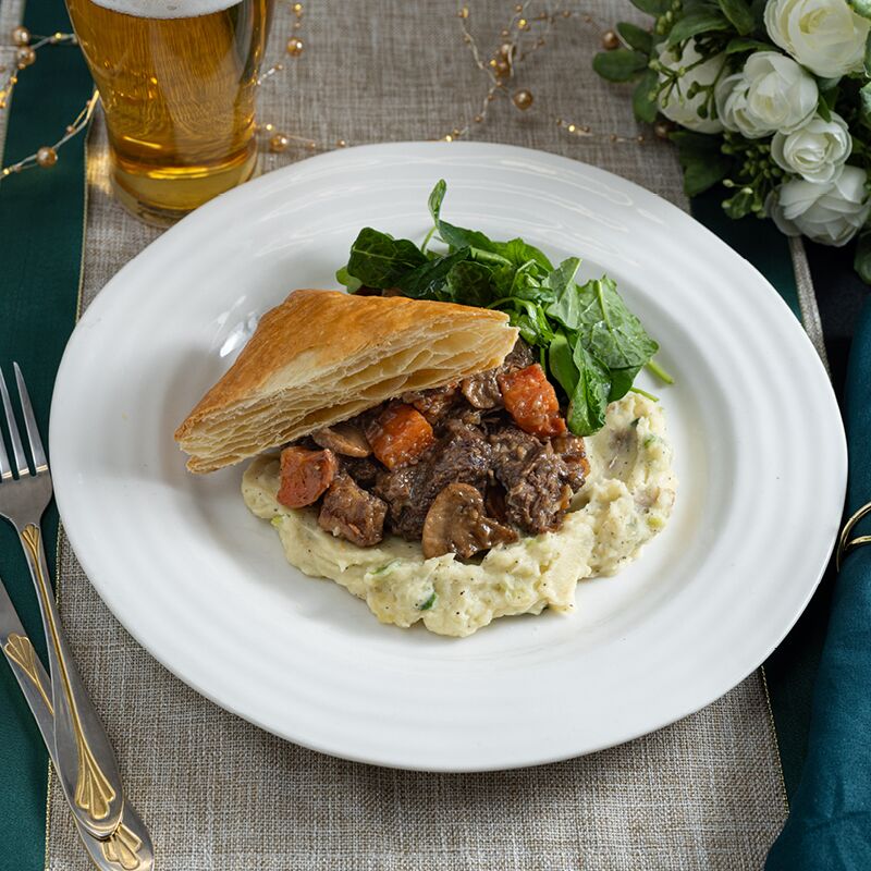 | Guinness Beef Pot Pie and Scallion Mashed Potato and Gravy | Place containers on oven safe tray and bake, uncovered, at 350°F for 20-25 minutes, until internal temperature reaches 165°F (74°C). |