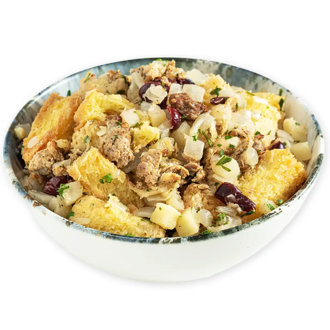 A golden Roasted Turkey with savoury Turkey Gravy and a tart Cranberry Ginger Sauce is the star of your springtime spread. Alongside it is a rustic Cranberry Apple Sausage Stuffing, creamy Chive Mashed Potatoes, vibrant Roasted Baby Carrots, and crisp Green Beans.