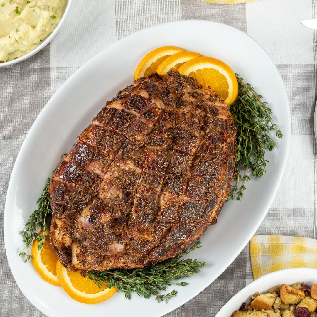 A juicy Maple Glazed Ham with tangy Honey Mustard Sauce is the star of your springtime spread. Alongside it is a rustic Cranberry Apple Sausage Stuffing, creamy Chive Mashed Potatoes, vibrant Roasted Baby Carrots, and crisp Green Beans.