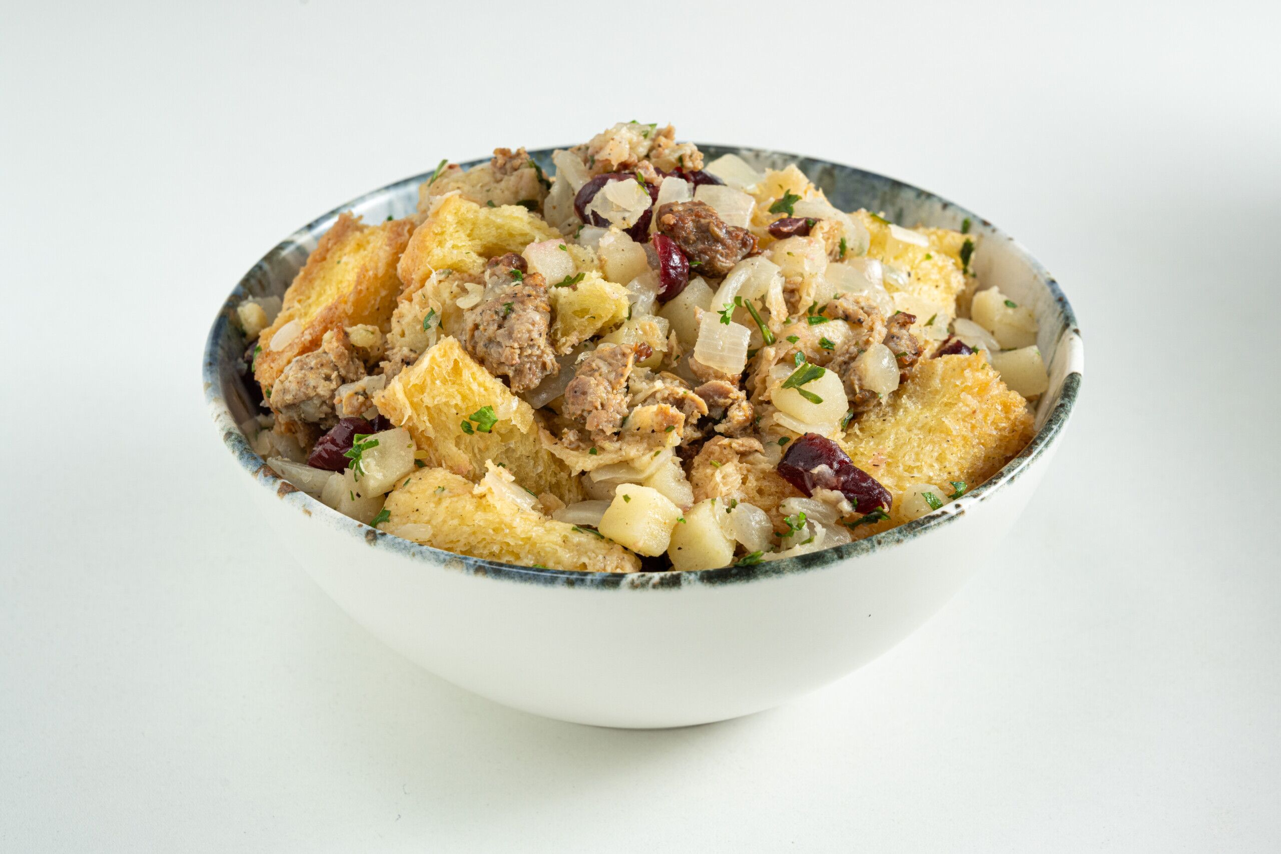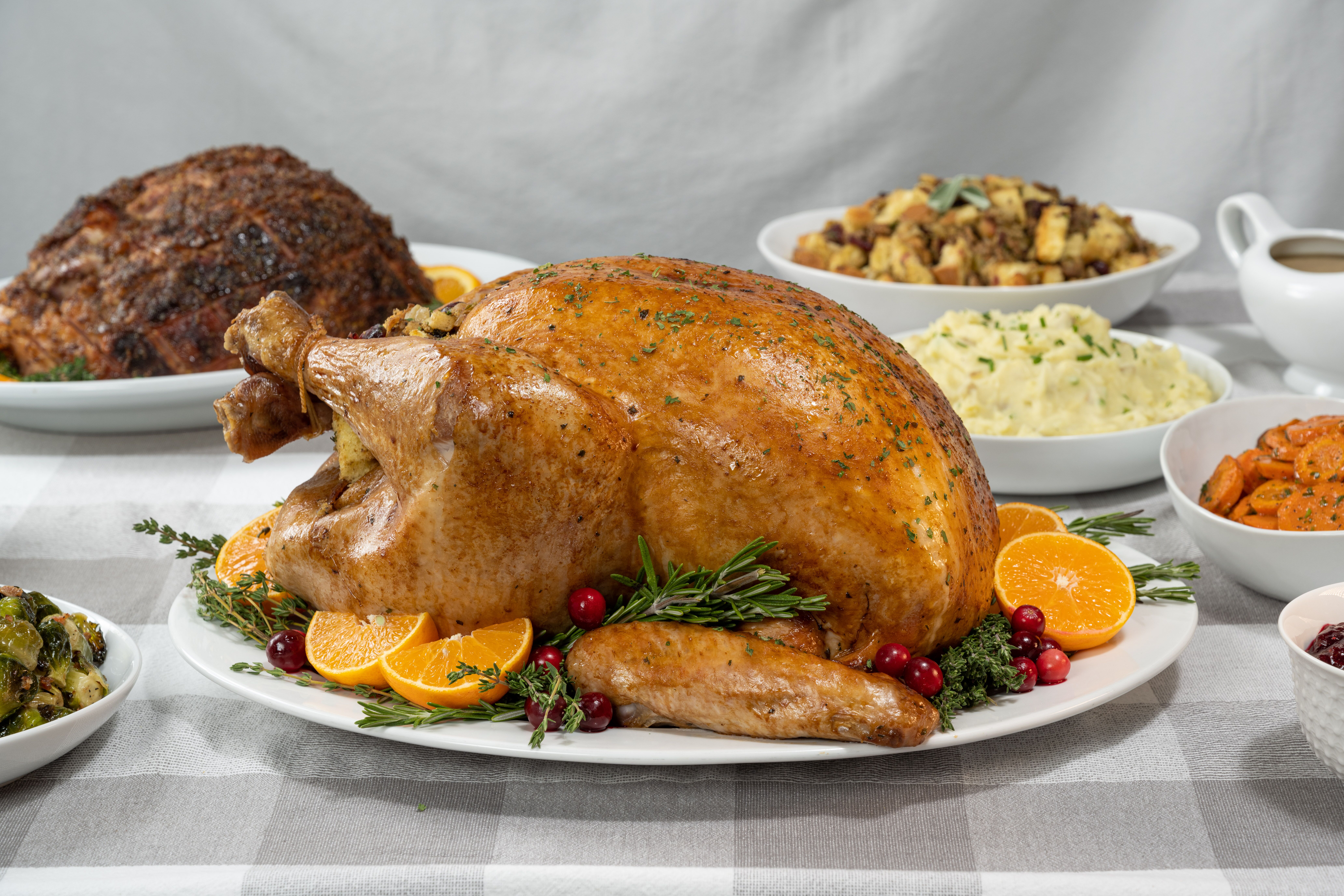 - A golden Roast Turkey with savoury Turkey Gravy and a tart Cranberry Ginger Sauce is the star of your holiday spread. Alongside it is a rustic Cranberry Apple Sausage Stuffing, creamy Chive Mashed Potatoes, vibrant Roasted Baby Carrots, Sliced Roasted Brussel Sprouts, and luscious Garlic Butter.